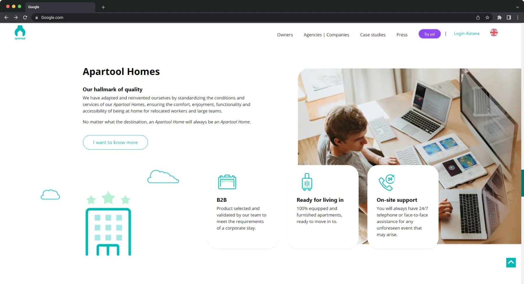 Disseny i desenvolupament del web per a Apartool, startup d’allotjament i reubicació per a treballadors. Web corporativa amb info de l’empresa, el negoci i l’app Katana, orientada a captació de leads.